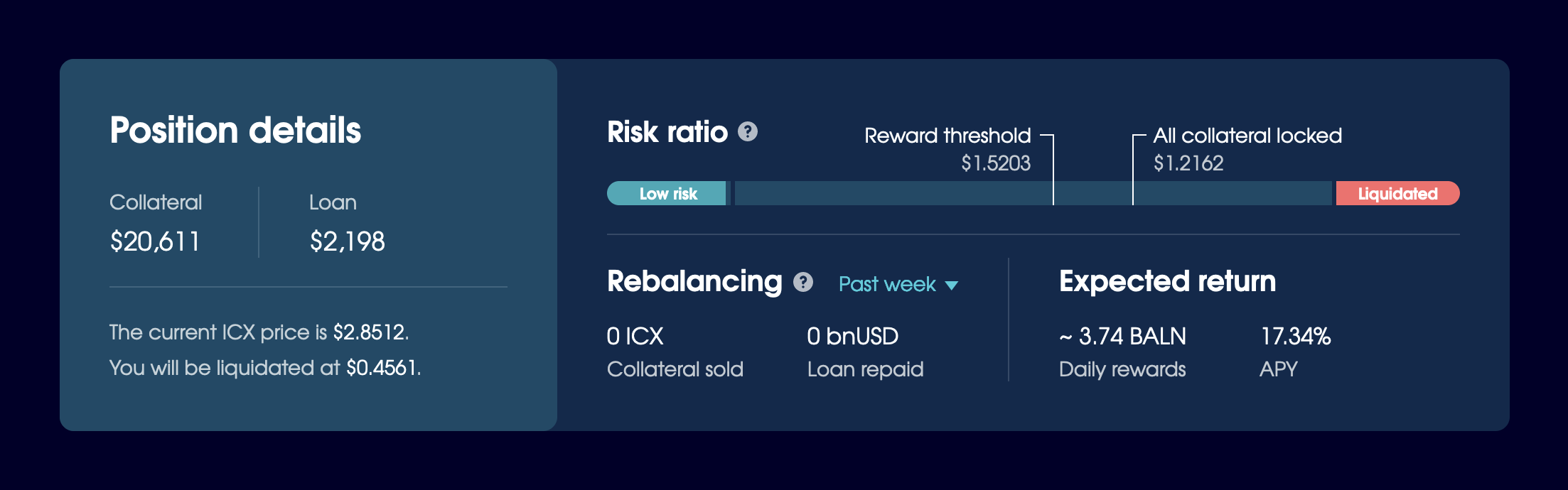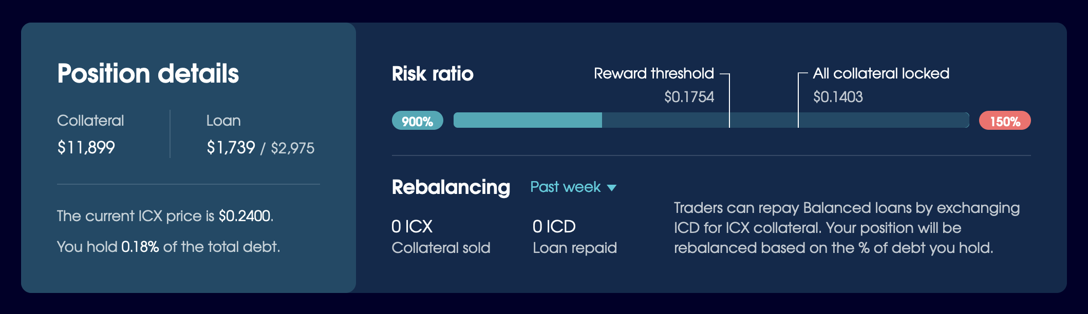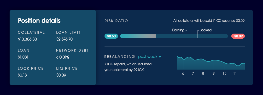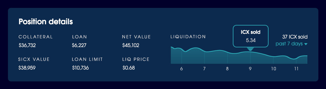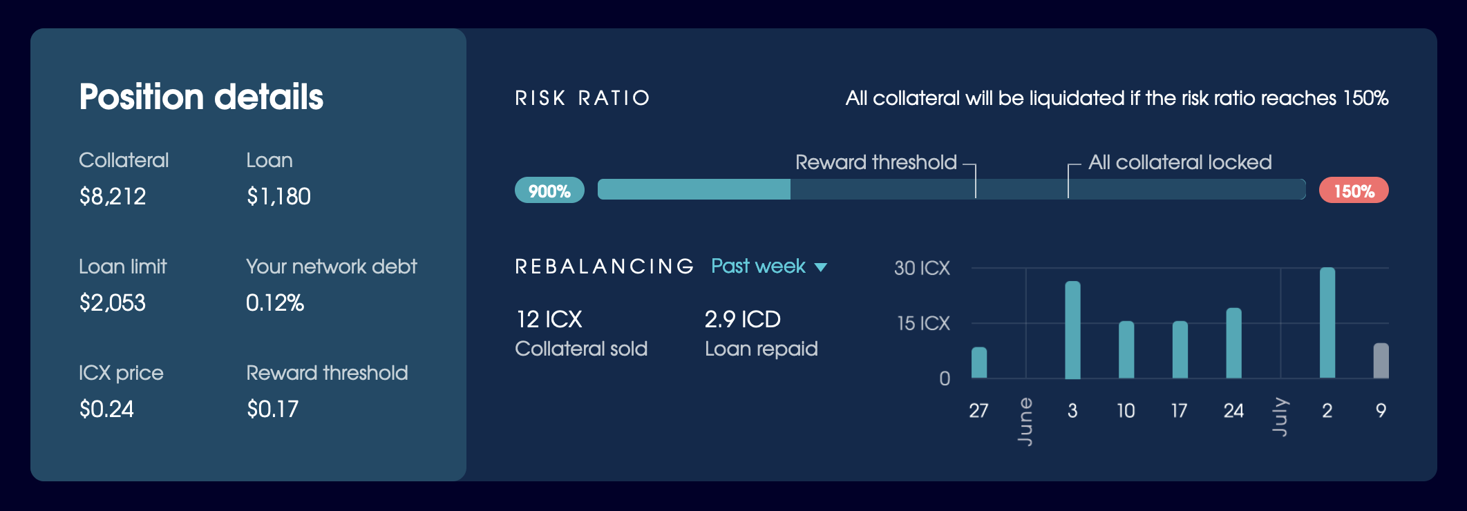 - Their risk ratio, collateral value, reward threshold, and loan limit, which constantly fluctuate with the price of ICX