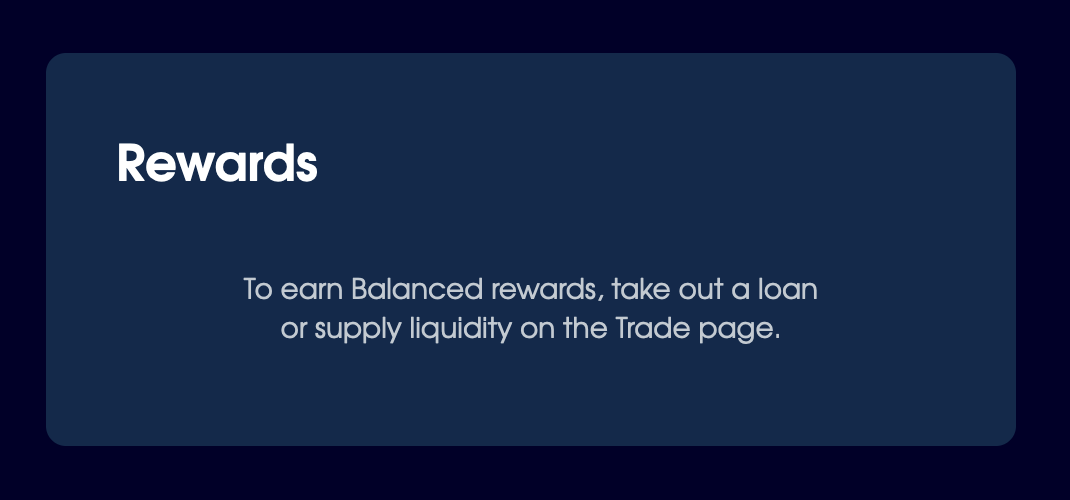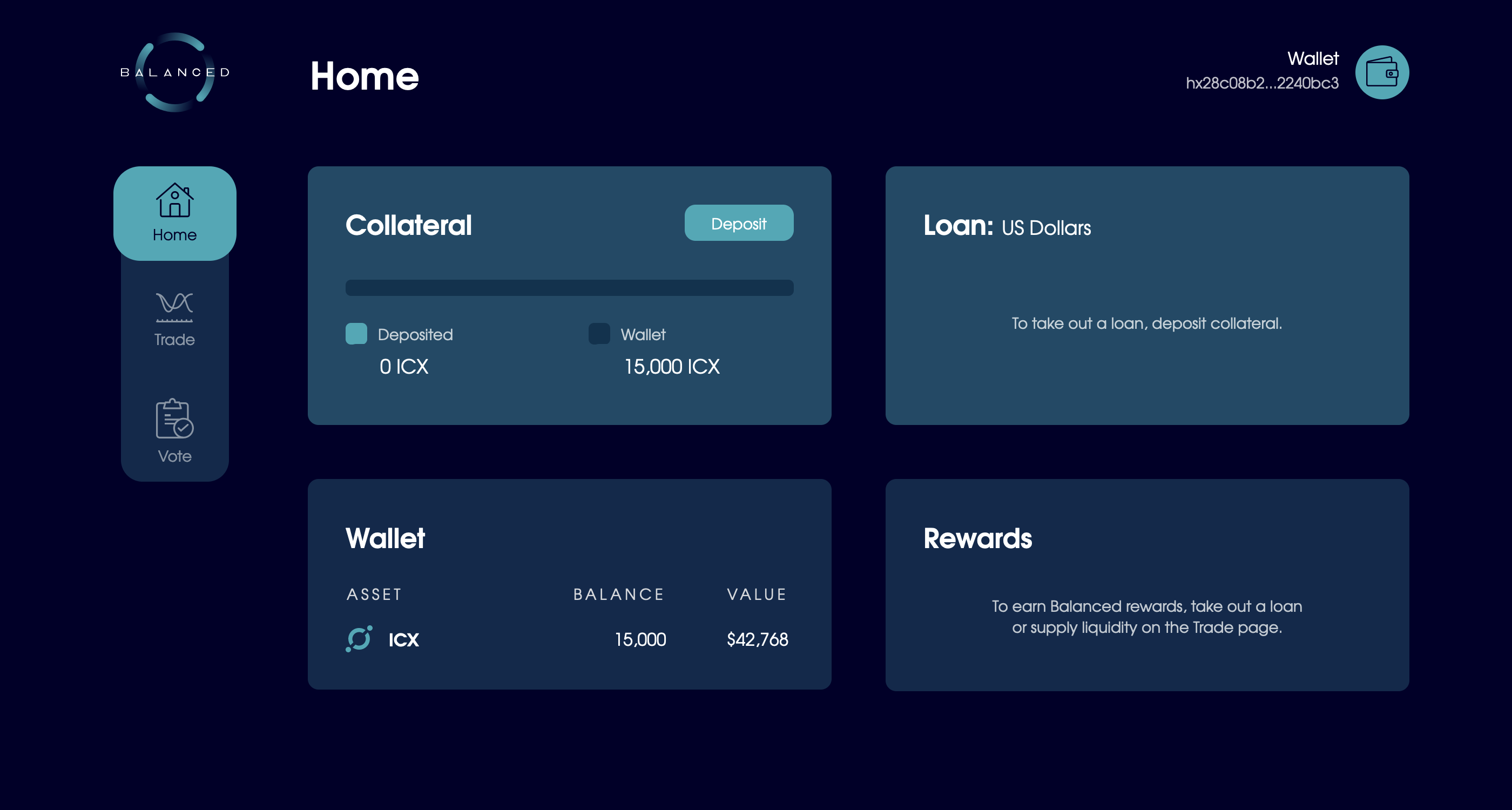 The core purpose of the Home page is to borrow Balanced Dollars. You need to deposit collateral first, so that’s the only action you’ll see available when you sign in. Even if your goal, as you see it, is to earn rewards or borrow bnUSD, the content in each section directs you where you need to go — without getting in your way.