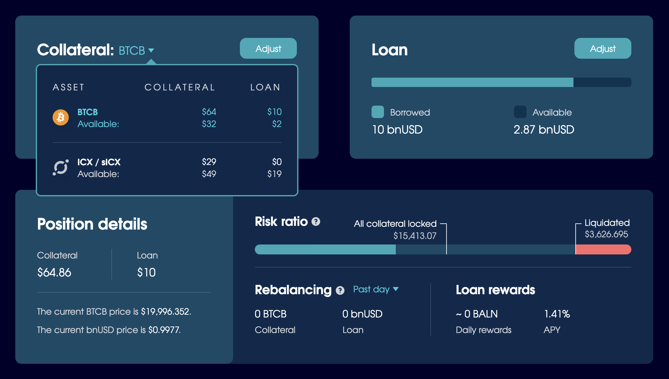 - The collateral and loan values, which both decrease (rebalance) if a trader retires (burns) bnUSD