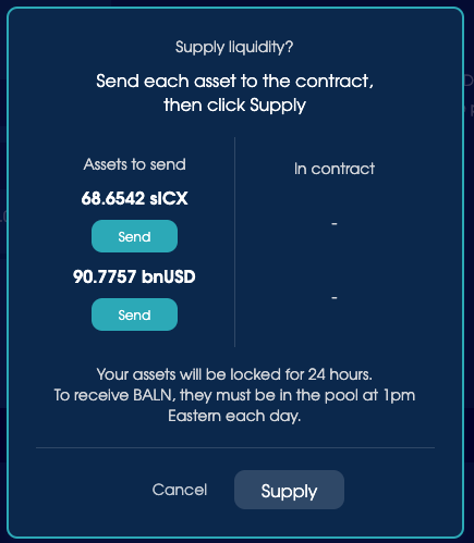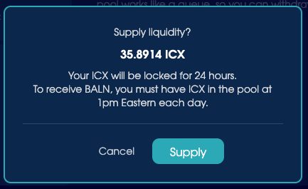 Two variations of the supply liquidity confirmation modal, which also warn you about the lock-up period and BALN reward requirements.